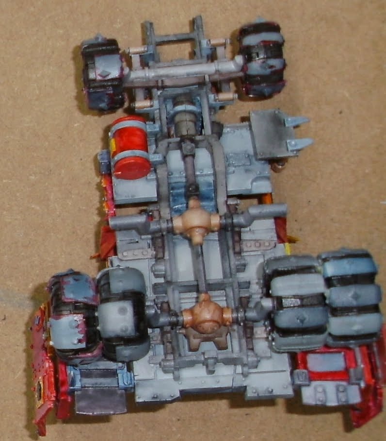 Ganz fertig ist so ein Orkgefährt natürlich nie: die breite Bauweise erlaubt hinten eine Doppelbereifung, so dass die mittlere Achse als Halterung für ein paar Messer freibleibt, die müssen noch drangestiftet werden. Und ein paar Decals für die Frontplatte spendiere ich evtl. auch noch irgendwann.